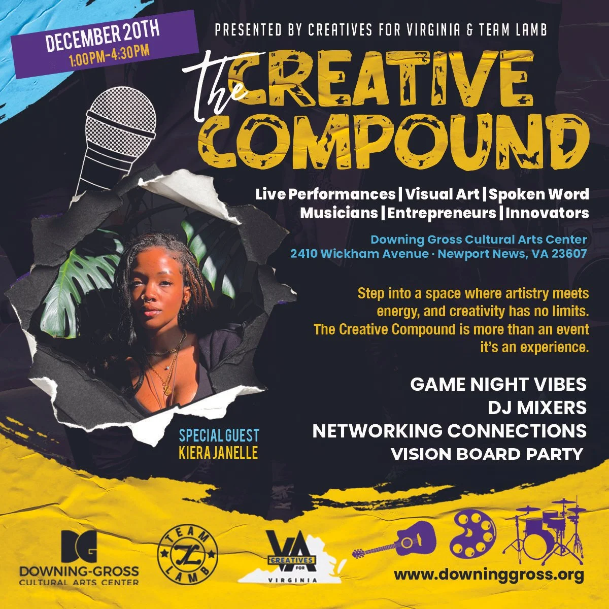 Presented by Creatives For Virginia and Team Lamb, step into a space where artistry meets energy, and creativity has no limits. The Creative Compound is more than event, it’s an experience. Featuring game night vibes, DJ mixers, networking, and spotlight conversations for Hampton Roads creatives