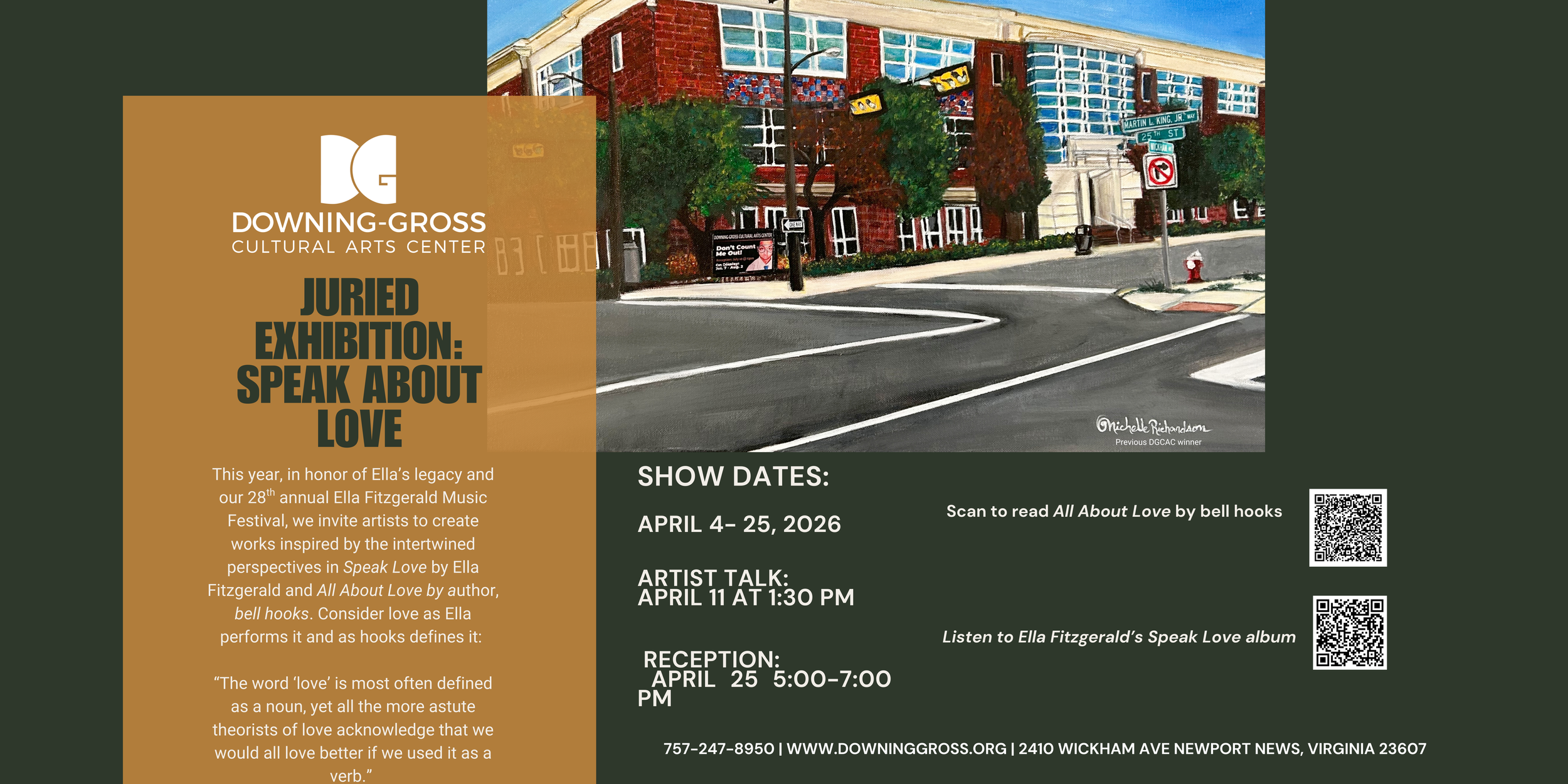 This exhibition brings together the visionary voices of Ella Fitzgerald and bell hooks, two cultural icons who reshaped how we understand art and love. In honor of Ella’s legacy, we invite artists to create works inspired by the intertwined perspectives in Speak Love and All About Love. Consider love as Ella performs it and as hooks defines it: “The word ‘love’ is most often defined as a noun, yet all the more astute theorists of love acknowledge that we would all love better if we used it as a verb.”
